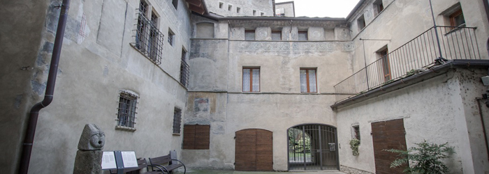 Sulla facciata si aprono due ingressi, uno carrabile, che porta ad uno scalone con volta a crociera, e l’altro ad uso delle persone, coronato da un arco a tutto sesto. La parte ovest si presenta come una torre quadrata sulla cima della quale si trova una finestra quadrilobata che dà luce alla Cappella barocca, ancora adorna di affreschi dai ricchi colori, risalenti alla seconda metà del ‘700 e realizzati da Giovanni Antonio da Biella. Ben evidenti ancora oggi, sulla parete che sovrasta l’arco, i segni dei proiettili la cui presenza ci ricorda la resistenza all’assedio di Napoleone del 1800.