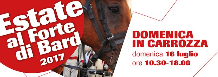 Domenica 16 luglio 2017, dalle ore 10.30 alle 18.00, appuntamento con Domenica in carrozza, itinerario panoramico in carrozza dal Borgo medievale al Forte di Bard. Servizio gratuito. Prenotazioni in loco.
