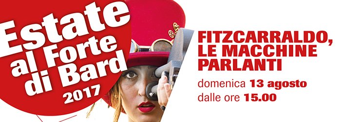 Spettacoli ed animazioni per grandi e piccoli nell’Estate del Forte di Bard. Domenica 13 agosto dalle ore 15.00 spazio alla mostra-spettacolo Fitzcarraldo, le macchine parlanti. Nelle piazze del Forte mostra e dimostrazioni di macchine parlanti, grammofoni, organetti, strumenti originali e funzionanti originali del XIX e XX secolo provenienti da musei e collezioni di tutta Europa presentati da una compagnia di eccentrici personaggi.