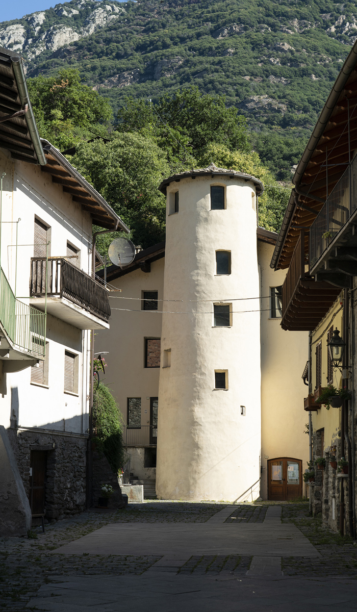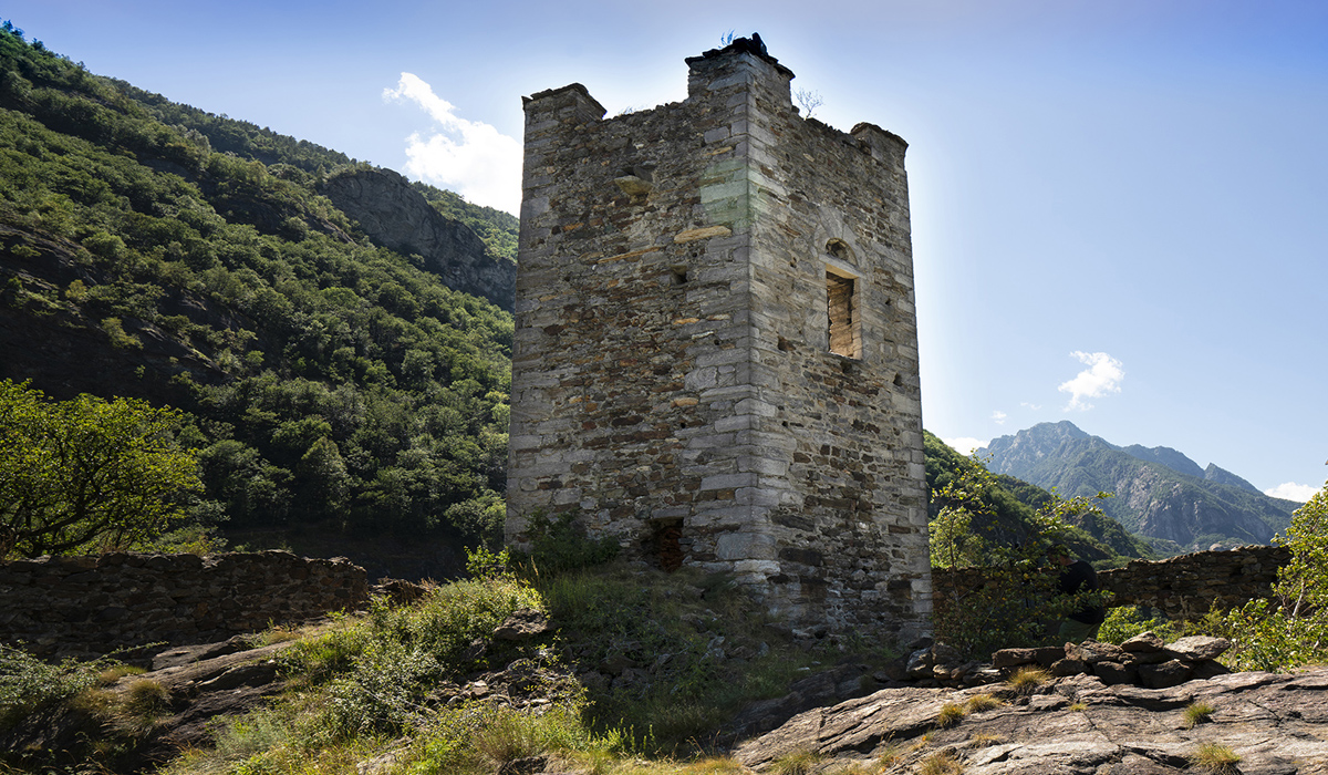 Il s’agit de la première tour que l’on rencontre en remontant la Vallée d’Aoste ; elle date du XIIIe siècle. Située à environ trente minutes de marche du hameau de Pramotton, la tour, de forme hexagonale, est ornée de six créneaux placés à chaque angle. L’entrée se trouve à quatre mètres au-dessus du sol et on peut encore voir une partie du mur d’enceinte qui à l’origine l’encerclait.