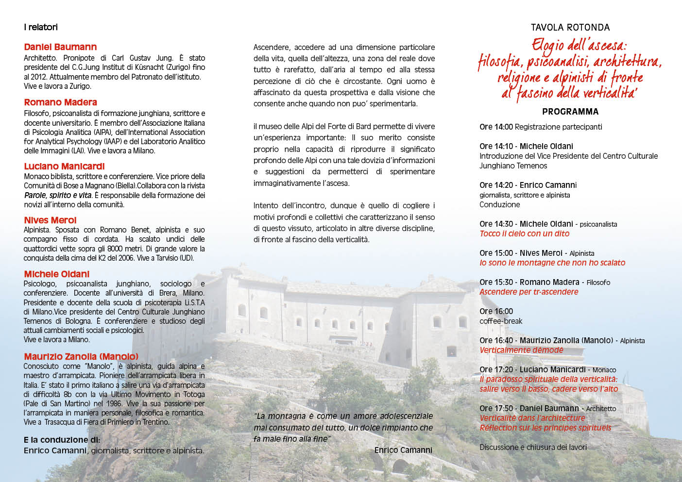 Il Centro culturale Junghiano Temenos di Bologna organizza al Forte di Bard, sabato 12 luglio 2014, una tavola rotonda sul tema Elogio dell’ascesa: filosofia, psicoanalisi, architettura, religione e alpinisti di fronte al fascino della verticalità.